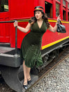 Grün 1940er Tief V-Ausschnitt Perle Samt Kleid