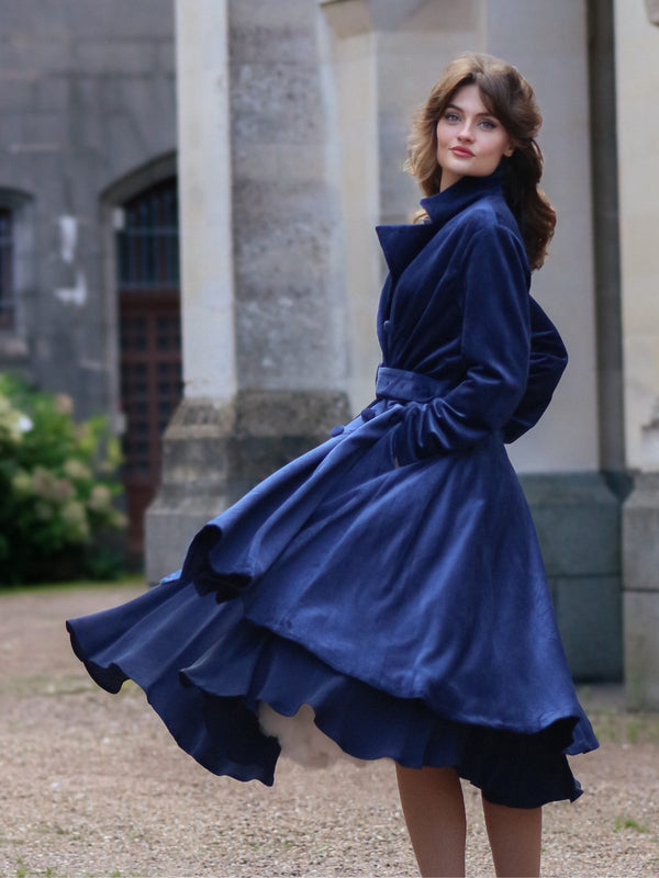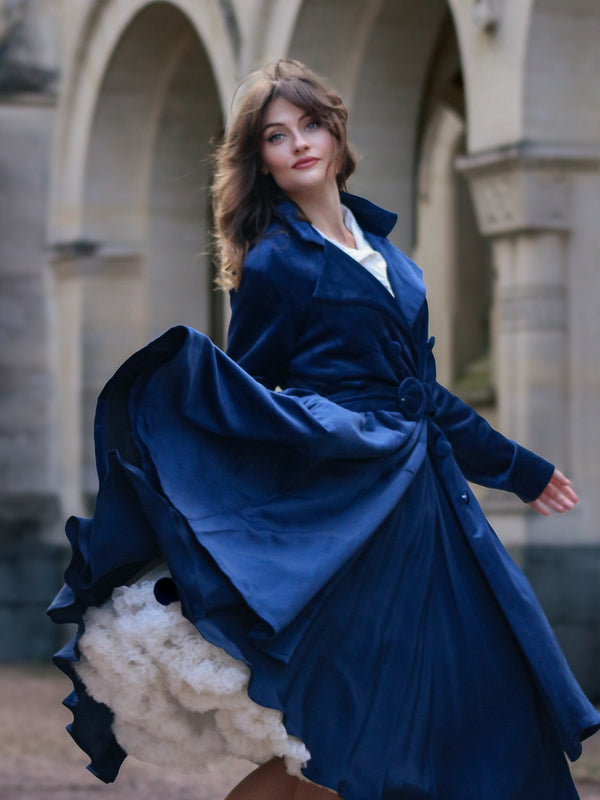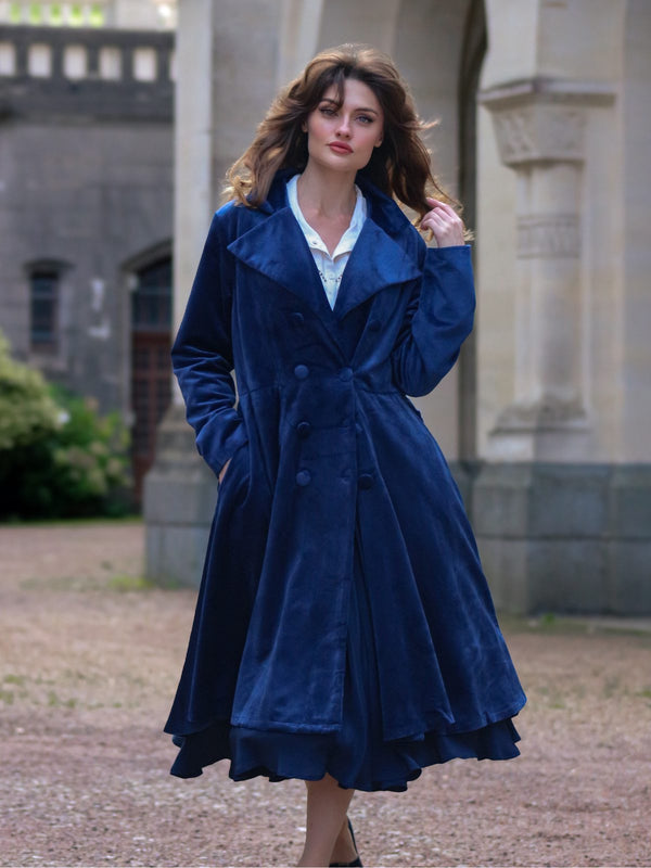 Dieser mittellange, marineblaue Samtmantel im Stil der 50er wird Sie definitiv überraschen! Der elegante und klassische Vintage-Mantel ist perfekt für den Winter und kann bei der Arbeit, zu Verabredungen und im Alltag getragen werden. Das Label hat nicht nur den professionellen Anzugstil, sondern offenbart auch ein Gespür für Luxus und unterstreicht Ihr anmutiges Temperament. Der Cordstoff fühlt sich zart, glatt und hautfreundlich an und vereint perfekt Temperatur und Ausstrahlung, was ihn bequem, warm und stilvoll macht. Dieser Vintage-Mantel hat Taschen auf beiden Seiten und einen abnehmbaren Gürtel in der Taille zum einfachen Festziehen und für eine eng anliegende Taille. Der klassische, rockartige Saum der 50er bringt Ihre weibliche Eleganz und Ihren Charme voll zur Geltung. Machen Sie sich bereit, alle mit diesem Retro-Mantel zu überraschen. Sie werden einen wunderschönen Mantel mit Blütenblattsaum haben, wie eine echte Dame der 50er!