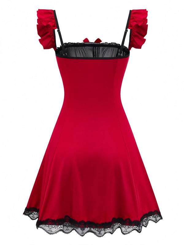 Rot 1960er Bogen Spitze Patchwork Rüschen Nachthemd