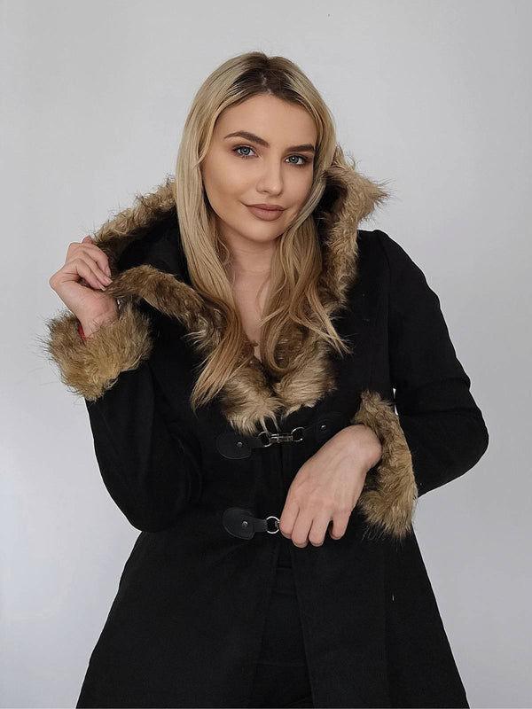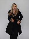 Schwarz 1950er Solide Schnalle Fell Getrimmt Mantel