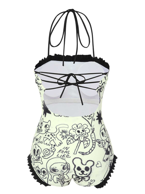 1960er Halter Bedrucktes Rüschen Einteiliger Badeanzug