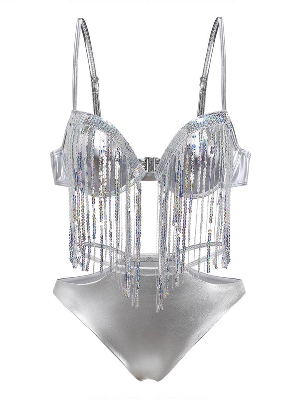 Silber 1970er Holographisch Pailletten Fransen Bikini Set