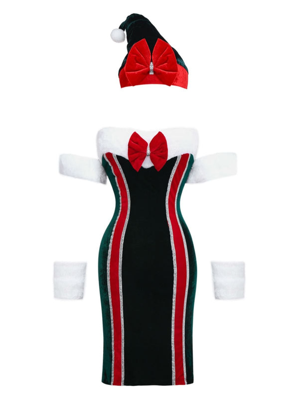 1960er Trägerlos Samt Weihnachten Pelzbesatz Bogen Kleid Set