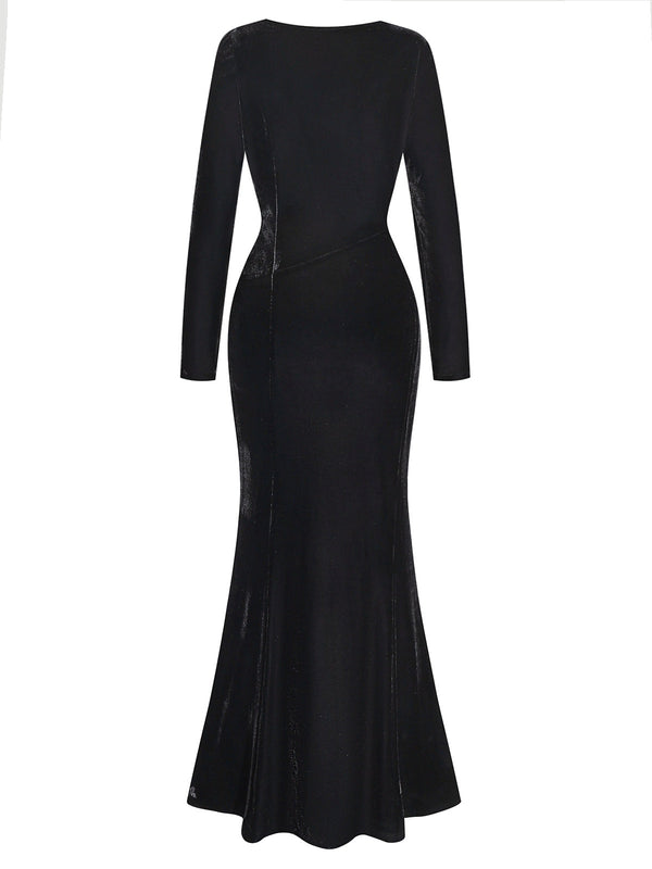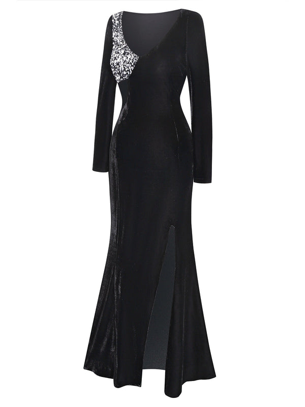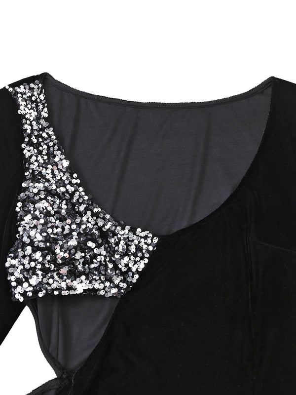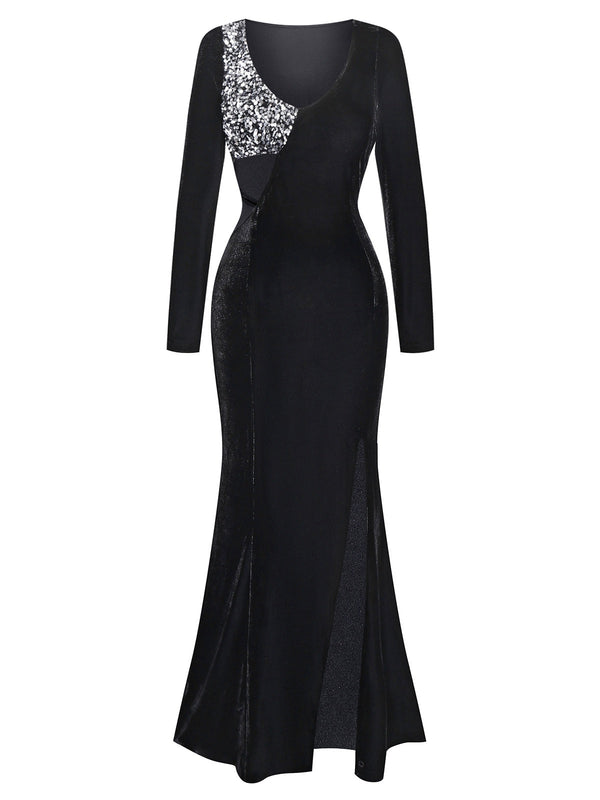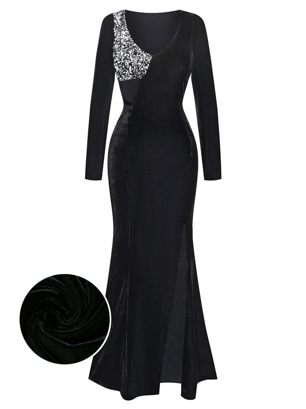[Vorverkauf] Schwarz 1930er Pailletten Samt Cutout Fischschwan Kleid