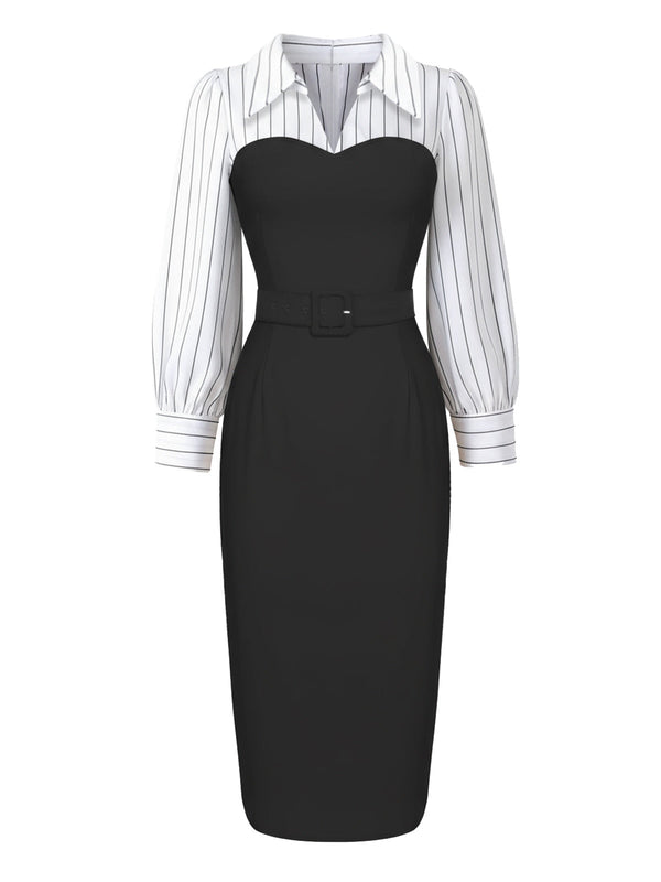 [Vorverkauf] Schwarz 1960er Nadelstreifen Revers Bodycon Kleid