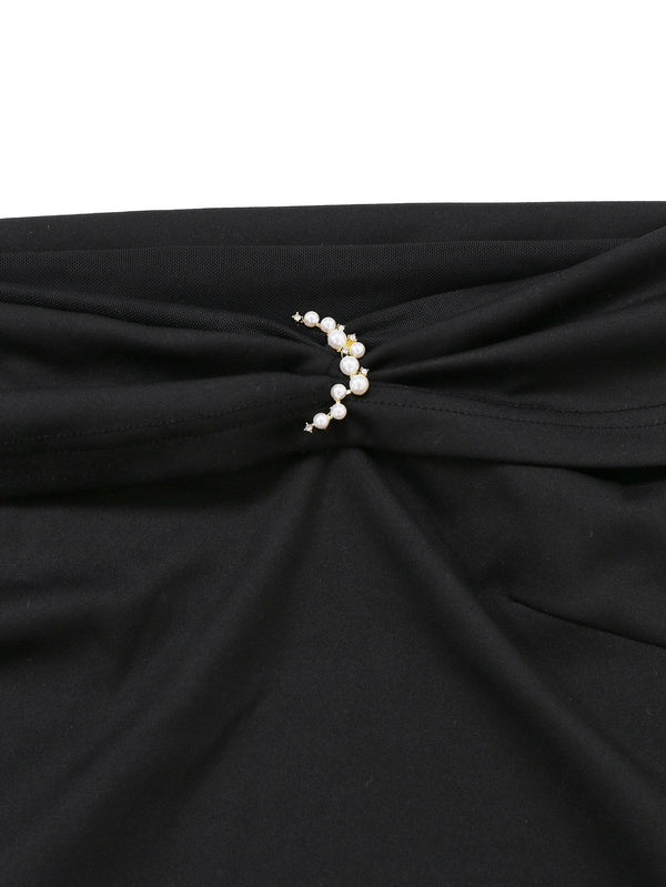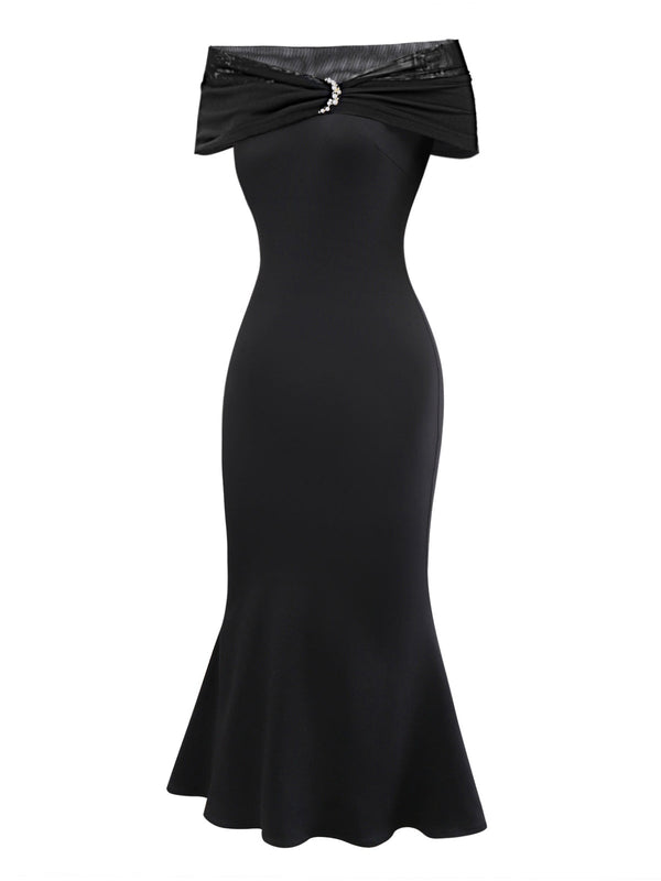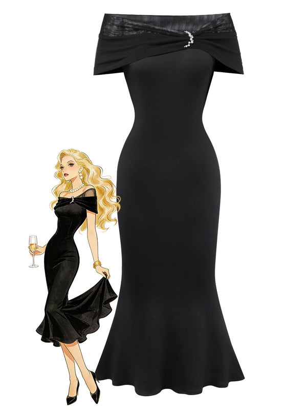 [Vorverkauf] Schwarz 1930er Schulterfrei Netz Fischschwanzkleid