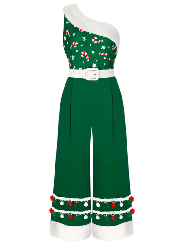 [Vorverkauf] [Übergröße] Grün 1950er Eine Schulter Fell Gürtel Jumpsuit