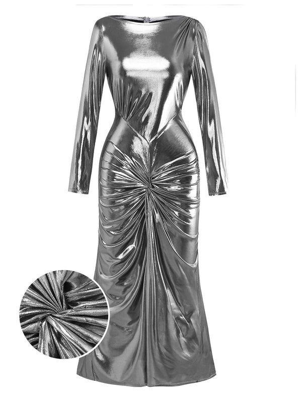 [Vorverkauf] Silber 1970er Metallisch Twist Bootskragen Schlitz Kleid