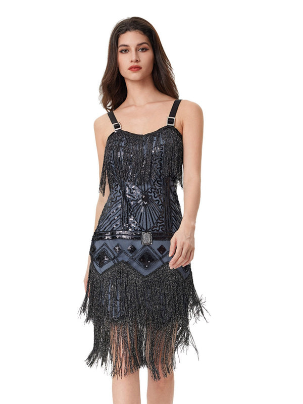 Blau Grau 1920er Pailletten Quaste Ball Perlen Slip Kleid