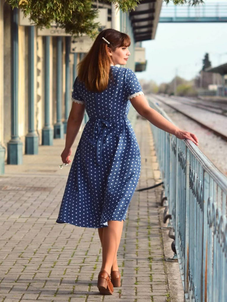 Dunkelblau 1930er V-Ausschnitt Polka Dots Kleid mit Gürtel
