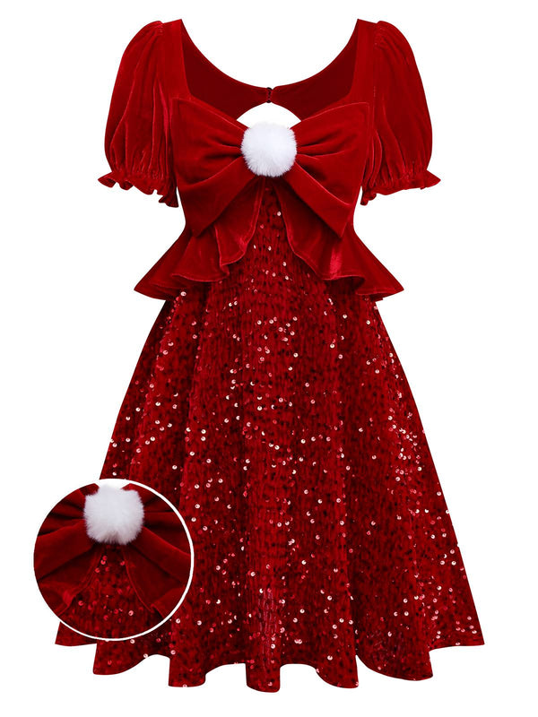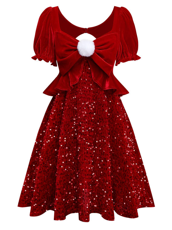 [Vorverkauf] Rot 1980er Paillette Bogen Puffärmel Babydoll Kleid