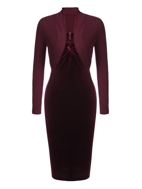2PCS Weinrot 1960er Samt Lange Ärmel Bleistift Kleid