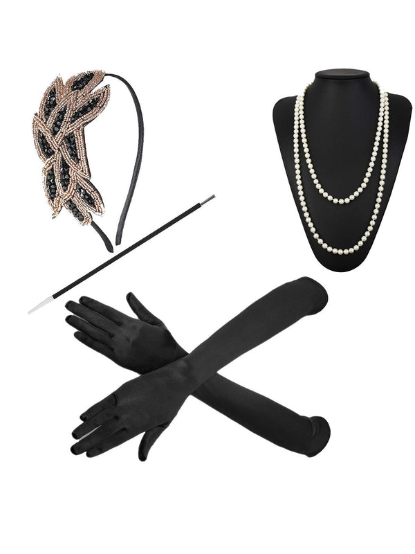 Packungsinhalt: 1 x Stirnband, 1 Paar x Handschuhe, 1 x Faux Perlenkette, 1 x Zigarettenspitze