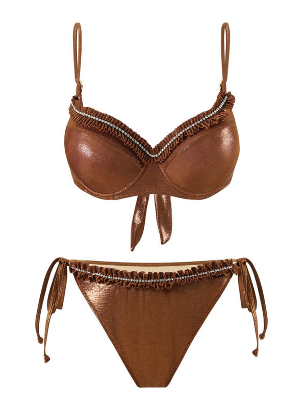 Braun 1950er Glänzend Strassstein Rüschen Bikini Set