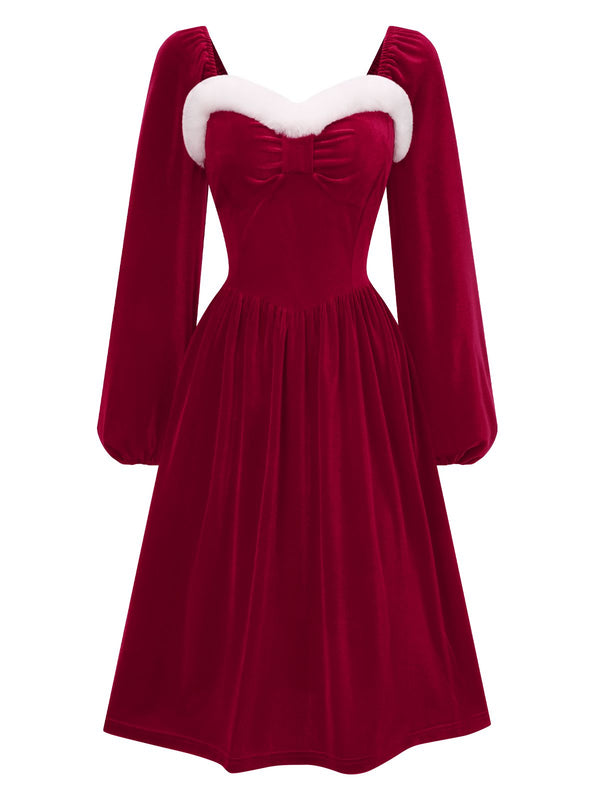 Weinrot 1940er Weihnachten Pelzkragen Solide Kleid