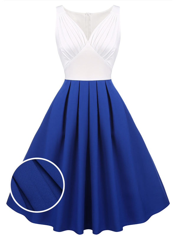 Macht das Leben zum Picknick, meine Damen! Dieses exquisite, plissierte, ärmellose Kleid im 50er-Jahre-Stil in Weiß und Blau ist perfekt geschnitten. Das taillierte Oberteil betont Ihre umwerfenden Kurven, und der weite, ausgestellte Rock schmeichelt jeder Figur.