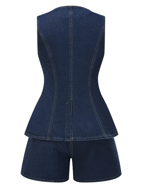 2PCS Blau 1960er Solide Geknöpft Denim Weste & Shorts