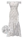 Blau 1930er Schulterfrei Blumen Rüschen Kleid