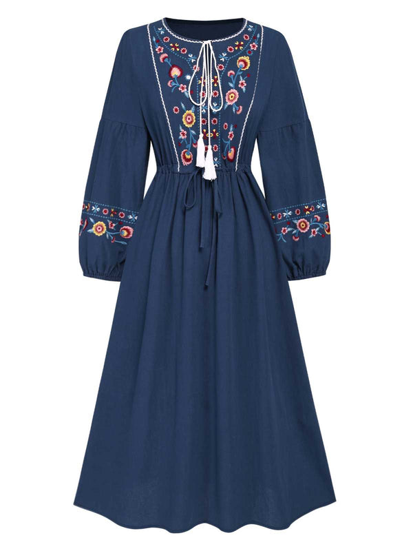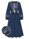 Blau 1940er Bestickt Blumen Laternenärmel Kleid