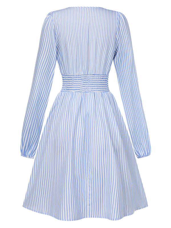 Blau 1940er V-Ausschnitt Streifen Lange Ärmel Kleid