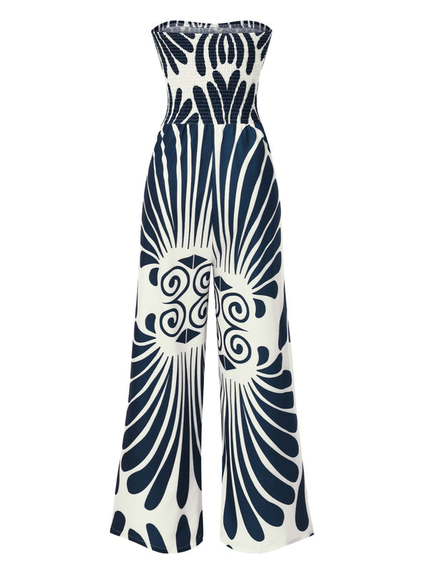 Blau 1960er Pflanzen Schulterfrei Weites-Bein Jumpsuit