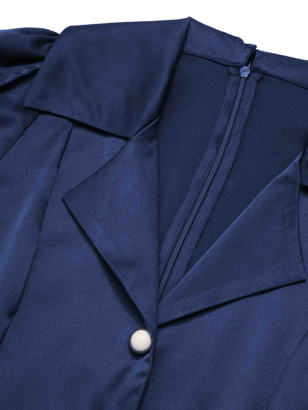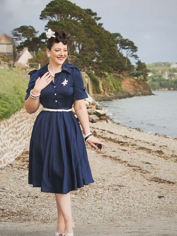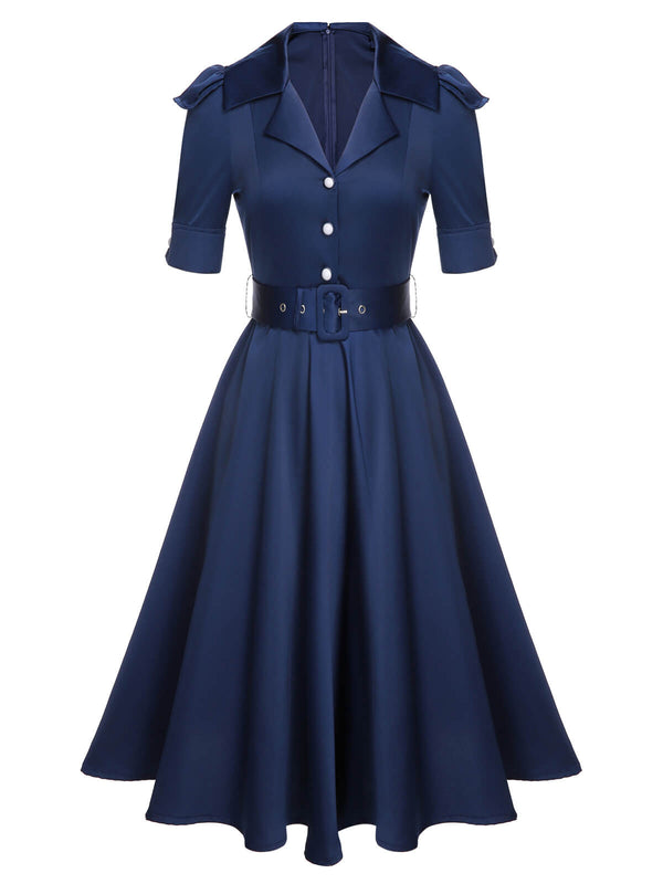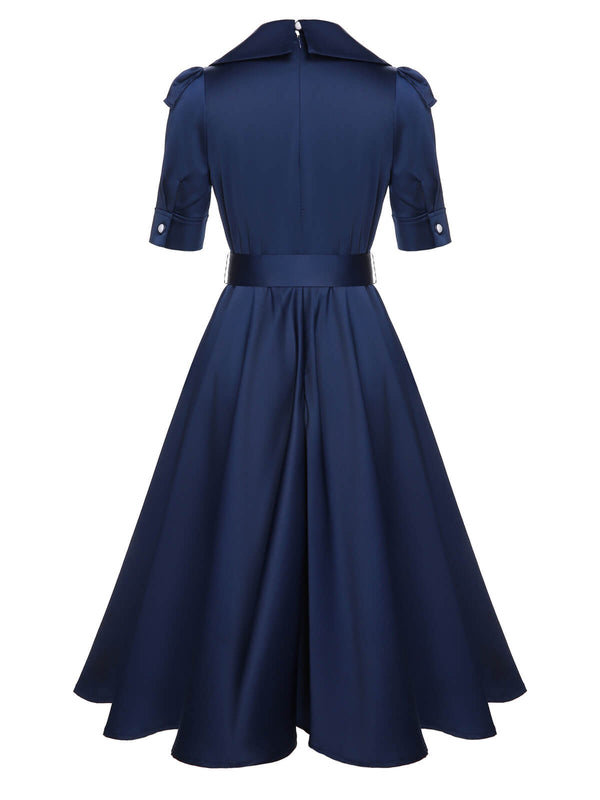 Blaues 1940er Kleid mit kurzen Ärmeln und Revers