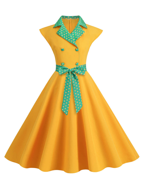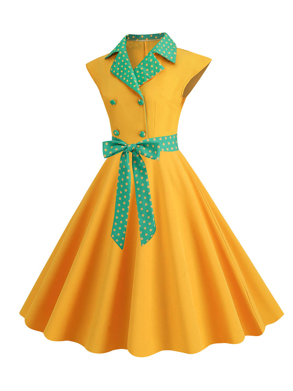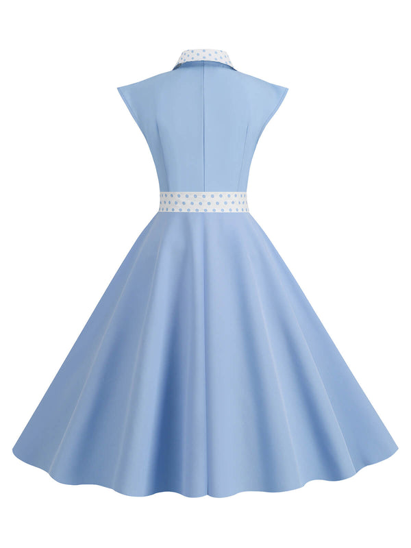 Dunkelblau 1950er Kontrastierenden Tupfen Schleifenknoten Gürtelkleid