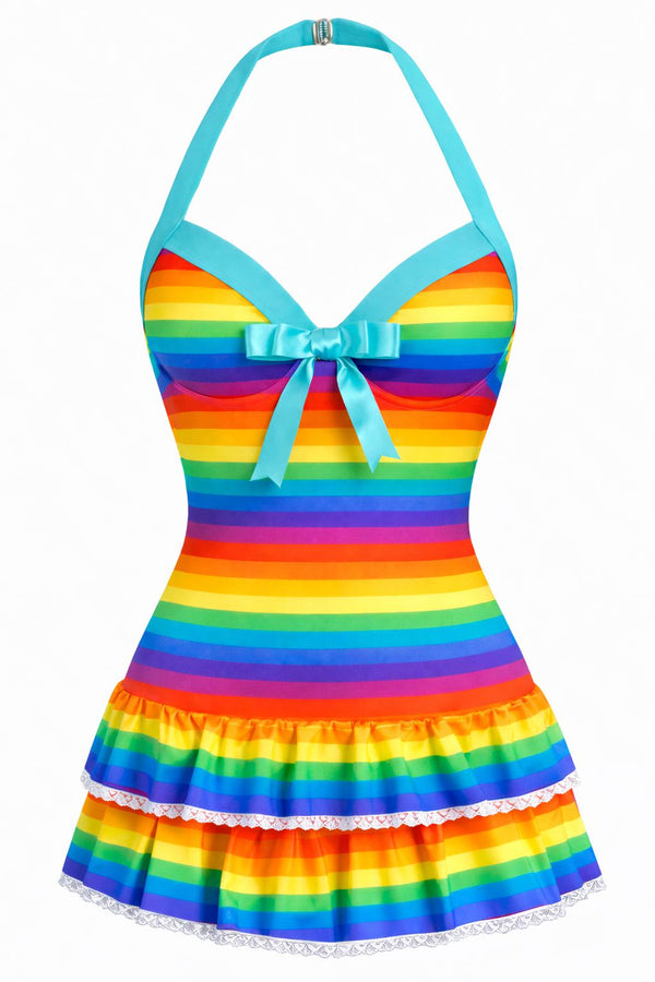 Eine verspielte Schleife auf der Vorderseite sorgt für einen Hauch von Verspieltheit, während sanfte Rüschen entlang des Oberteils Ihre Figur schmeicheln. Das hoch taillierte Design bietet vollständige Abdeckung und sorgt für Komfort, ohne dabei auf Stil zu verzichten. Kombinieren Sie ihn mit einem breitkrempigen Hut und einer Cat-Eye-Sonnenbrille für einen wahrhaft glamourösen Look.