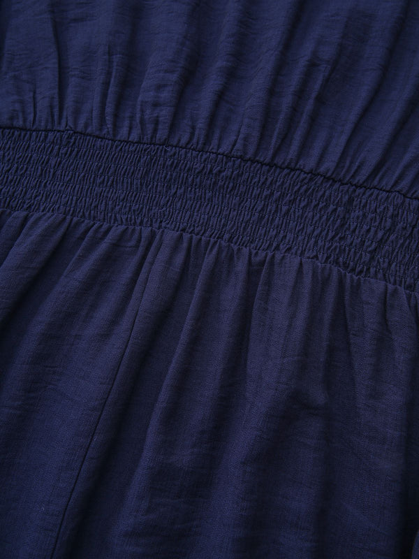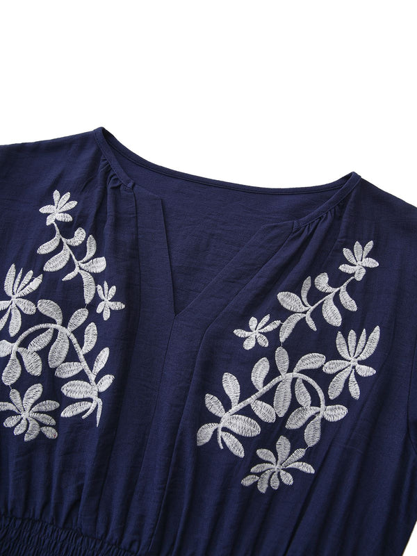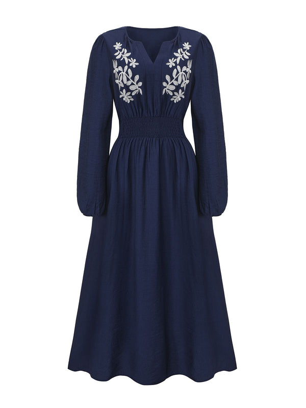Marineblau 1970er Blumen Besticktes Maxi Kleid