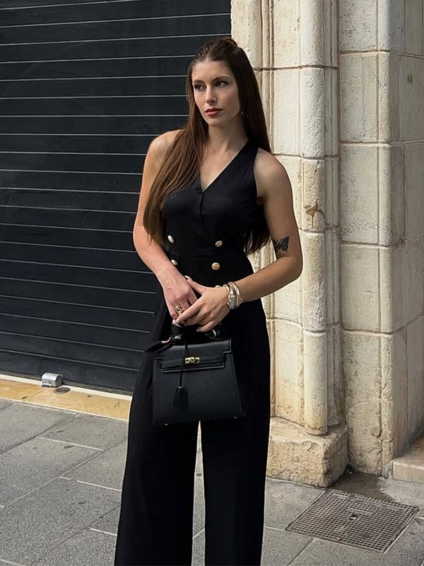 Schwarz 1950er Ärmellos Geknöpft Solide Jumpsuit
