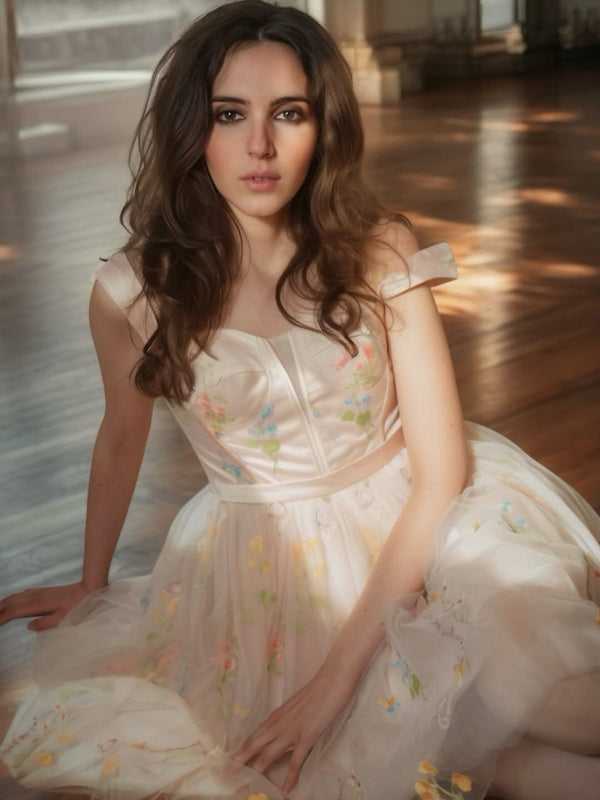 Beige 1970er Besticktes Blumen Spitze Mini Kleid