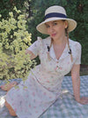 Beige 1940er Puffärmel Revers Blumen Kleid