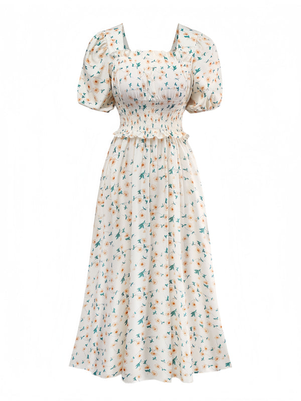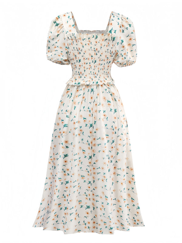 Gelb 1940er Blumen Quadratischer Hals Kleid