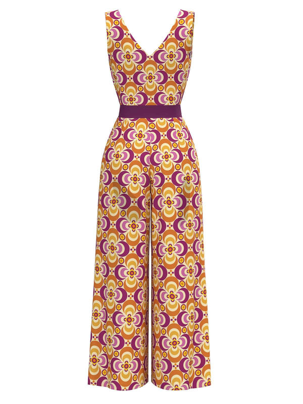 Orange 1960er V-Ausschnitt Gürtel Blumen Jumpsuit