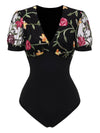 Schwarz 1970er V-Ausschnitt Bestickt Blumen Bodysuit