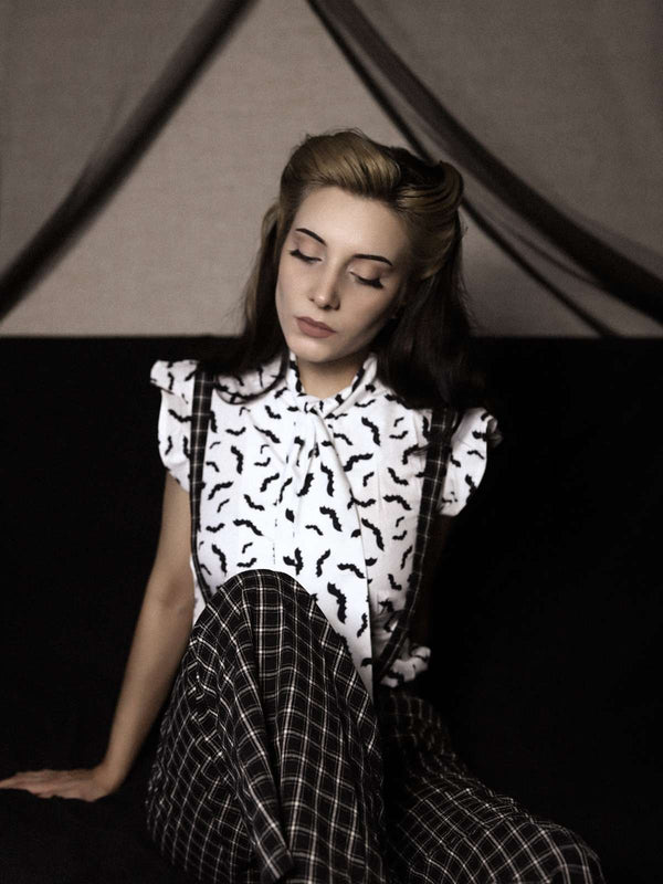 Erhöhen Sie Ihre Standards, Puppen! Dieses süße Blusenoberteil aus den 1950er Jahren ist in bezauberndem Schwarz & Weiß gehalten und verfügt über ein Mieder mit Prinzessinnennähten, das von einem Flügelärmel gesichert wird, der eine fabelhafte Passform zu Ihrer weiblichen Figur verleiht. Mit einem so besonderen Outfit wissen Sie einfach, dass Sie auf Ihrer Party, Ihrem Abschlussball oder Ihrer Teeparty eine Million Dollar sehen werden.