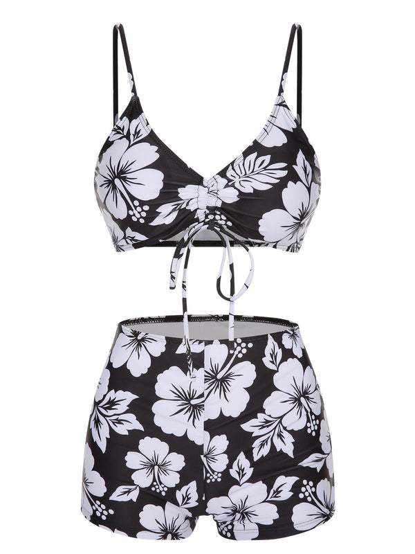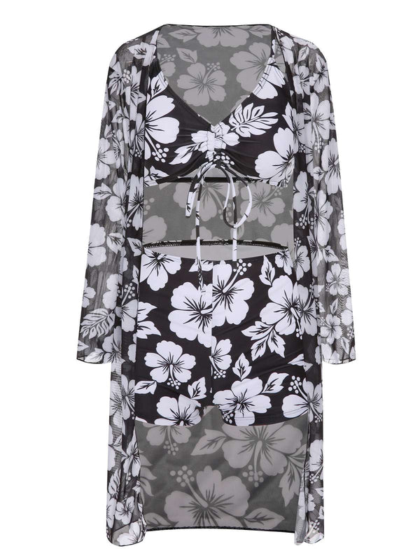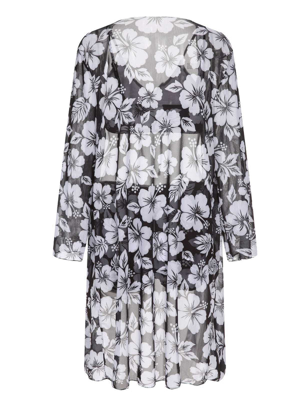 2PCS Schwarz 1950er Blumen Badeanzug & Cover-Up