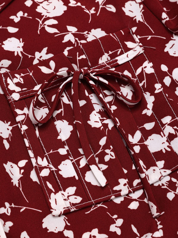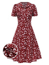 Rot 1950er Revers Knöpfen Blümchen Kleid