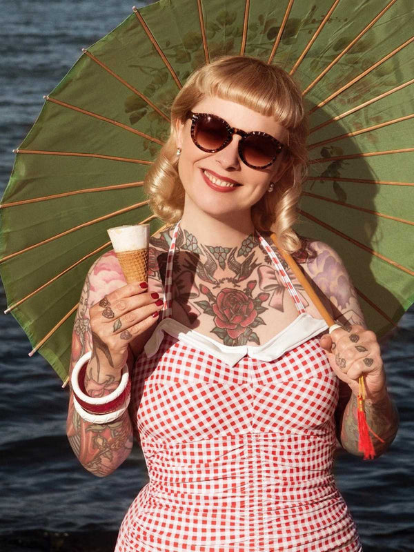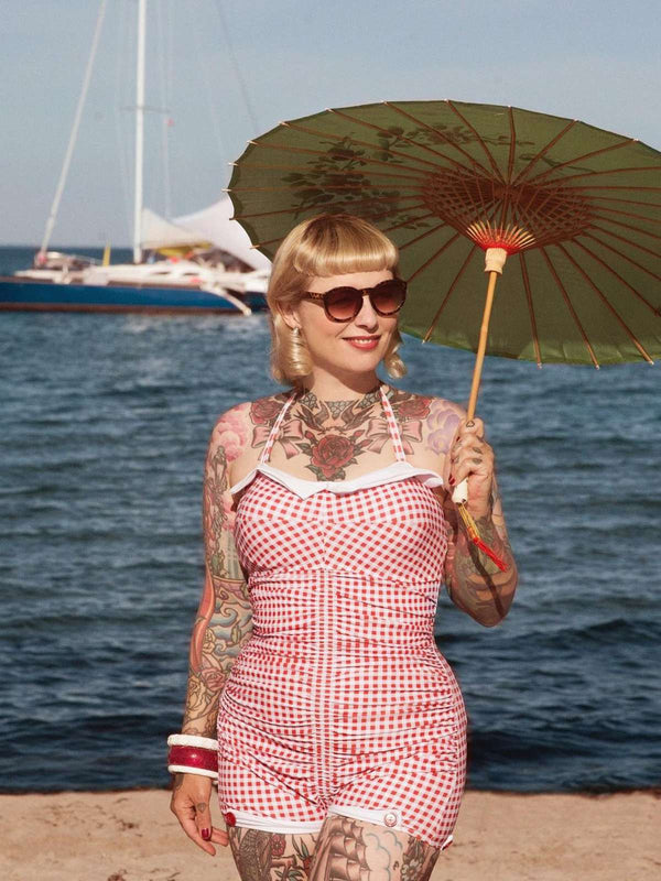 Dies ist Audrey Hepburns Lieblings-Vichy-Plaid-Print. Vintage-Badeanzüge sind der perfekte Weg, um die Retro-Ära im Sommer nachzuahmen. Basierend auf dem weißen Hintergrund werden horizontale und vertikale Streifen der gleichen Farbe und der gleichen Dicke in gleichem Abstand übereinander gelegt, und die Farbe wird dort dunkler, wo sie übereinander liegen, was der Retro-Bademode auch ein Gefühl von Layering im eleganten französischen Stil verleiht. Kennt noch jemand das Geheimnis, dass ein Karomuster Sie auf 18 zurückbringen kann? Sieht jung und schön aus! Einteilige Badeanzüge können auch Bauchfett verbergen. Ob in den 1920er, 1950er oder 1960er Jahren, Karos sind die Magie der Mode.
