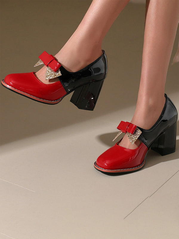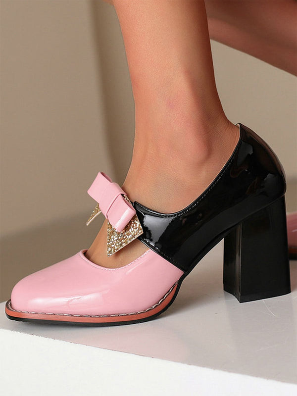 Mary Jane Farbblock Funkeln Bowknot Klobige Absätze