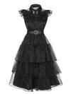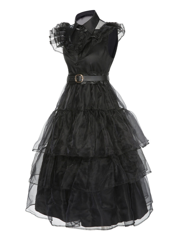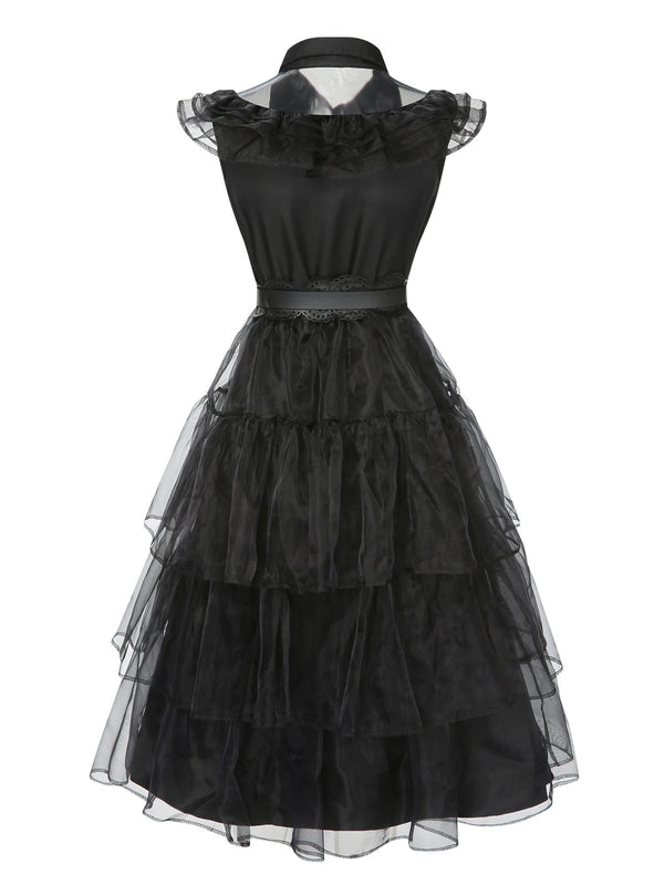 Erleben Sie den geheimnisvollen Zauber des Herbstes mit diesem mehrlagigen schwarzen Tüllkleid. Perfekt für Halloween-Feiern oder herbstliche Events im Gothic-Stil: Die gerüschten Lagen und der Gürtel verleihen ihm eine dramatische Silhouette. Dieses Kleid verbindet mühelos dunkle Romantik mit einem modernen Touch und ist damit das Highlight für die bezaubernde Atmosphäre der Saison.