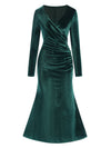 Dunkelgrün 1930er Samt Solide V-Ausschnitt Kleid