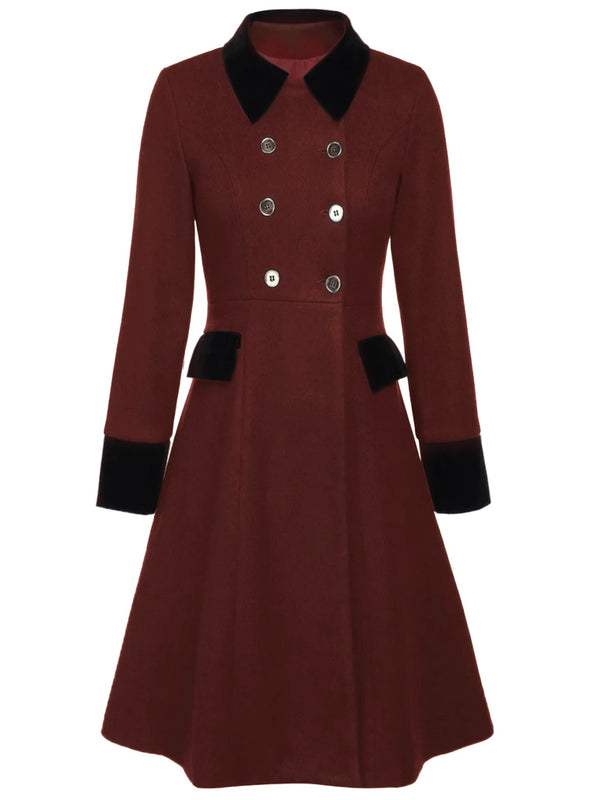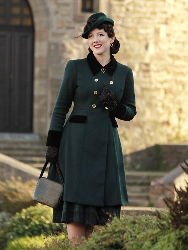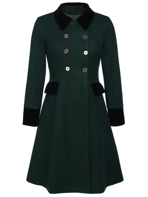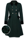 Der dunkelgrüne Vintage-Mantel aus den 1950er Jahren kann Ihnen im kalten Winter einen femininen Retro-Charme verleihen! Es ist ein Mantel, der zwischen zwei Kragenformen wechseln kann. Sie können alle goldenen Knöpfe und den schwarzen Ausschnitt, der sich um Ihren Hals legt, für Wärme und Eleganz zuknöpfen. Schwarze Spleiße am Ausschnitt und an den Bündchen verleihen dem Mantel eine Schicht, und auf beiden Seiten befinden sich praktische Taschen. Kombinieren Sie es mit unserer perlenbesetzten Blumenbrosche auf der Brust für Eleganz und Romantik! Oder entfernen Sie die Knöpfe in der ersten Reihe für einen klassischen Revers-Look und kombinieren Sie sie mit Ihrer Lieblingskette.