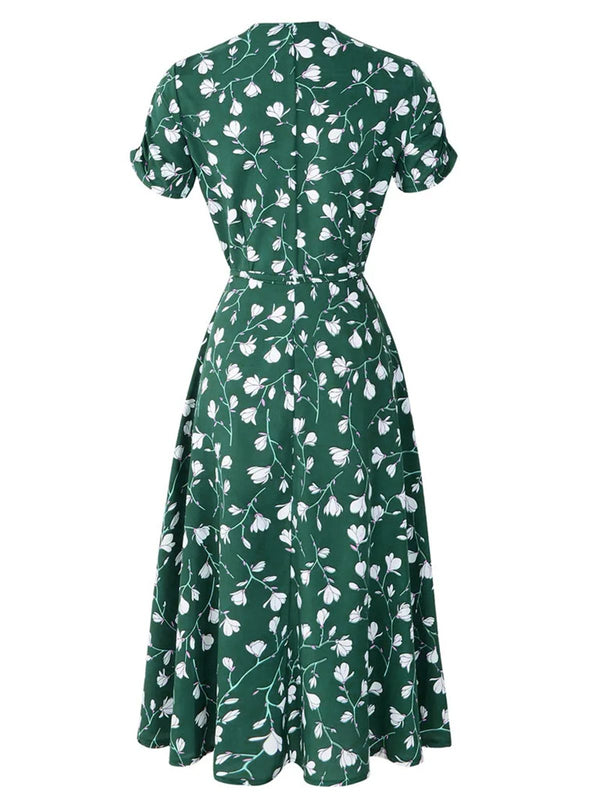 Grün 1940er V-Ausschnitt Blumen Kleid