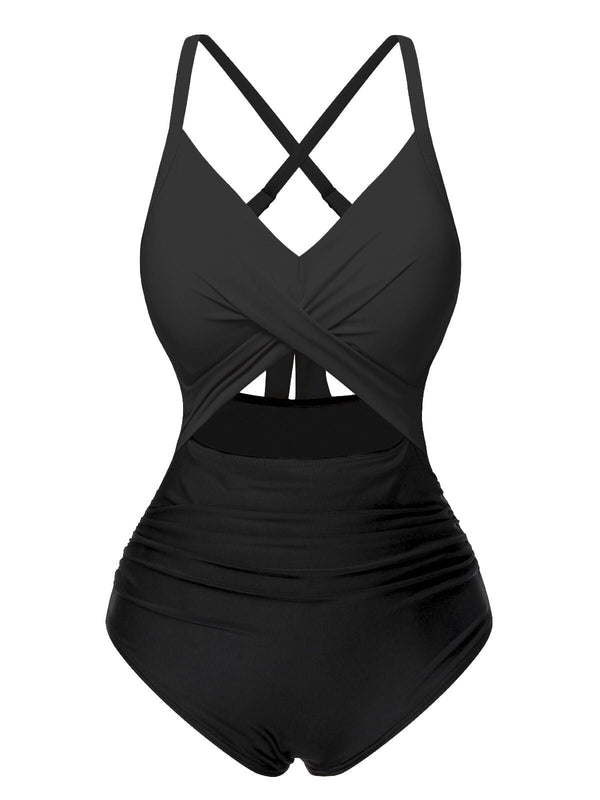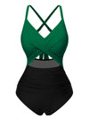 Grün & Schwarz 1940er Hohl Taillen Patchwork Badeanzug