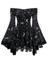 1980er Stern & Mond & Sonnengesicht Schulterfrei Glockenärmel Kleid