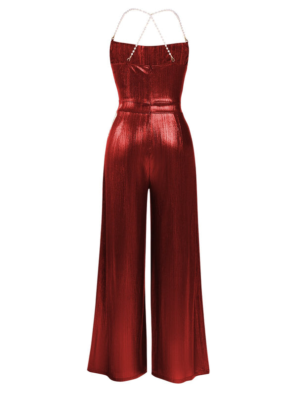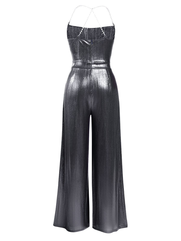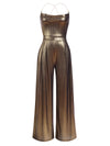 Disco outfit Metallic Gold 1980er Wasserfallkragen Spaghetti Träger Jumpsuit