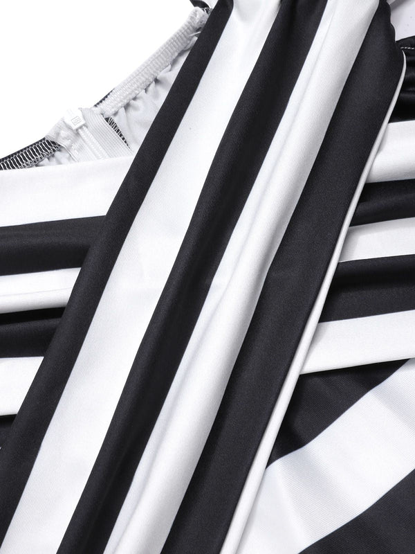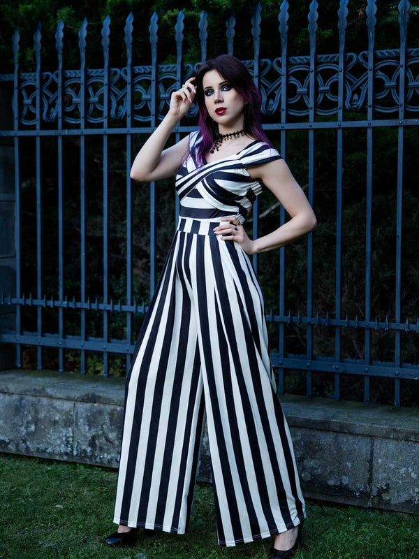 Dieser auffällige schwarz-weiß gestreifte Jumpsuit verbindet mühelos die Jahreszeiten und ist die perfekte Wahl vom Spätsommer bis in den Herbst. Die luftige Silhouette mit weitem Bein ist ideal für warme Tage, während die kräftigen Streifen und das schulterfreie Design einen verspielten, eleganten Touch verleihen. Halloween steht vor der Tür und die schicke Schwarz-Weiß-Palette passt perfekt zur festlichen Stimmung und verleiht Ihnen einen stilvollen Touch für jeden Anlass, vom sonnigen Nachmittag bis zum kühlen Herbstabend.