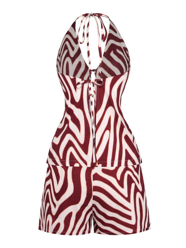 2PCS Braun 1970er Halter Tief V Streifen Top & Shorts