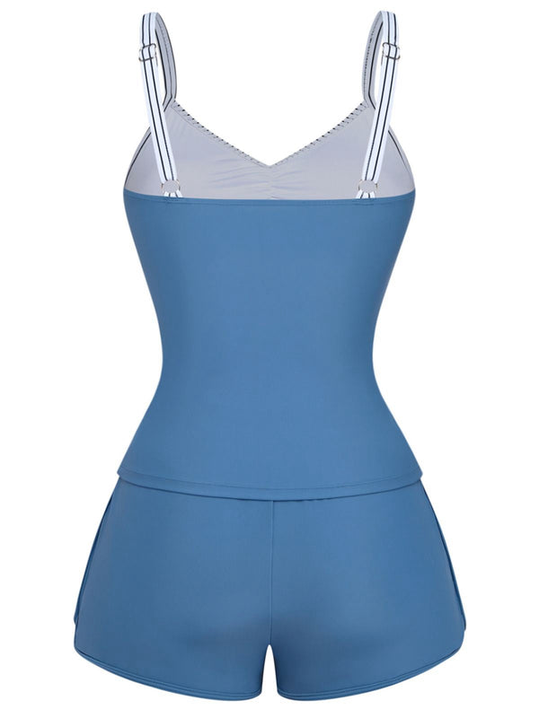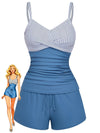 Blau 1940er Streifen Tasche Gerafft Bademode
